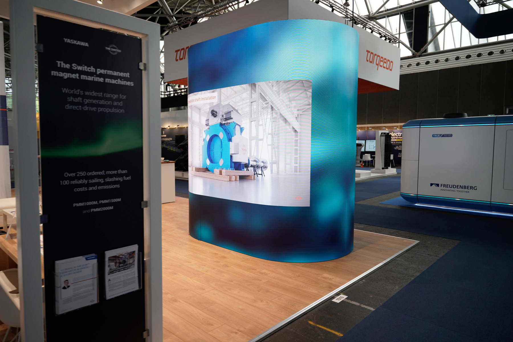 Hieman yleisestä linjasta poikkeavan Yaskawan osaston taustalla oli saarekepaikka ja se ettei asiakkaalla ollut tarvetta varasto- tai keittiötilalle. Osasto oli avoin ja ainoa jokseenkin suljettu osa oli läpikuultavasta lippuneuloksesta tehty VIP-tila, jossa esiteltiin laitteita. Tälläkin osastolla oli paljon huomiota saanut led-näyttö. Näytössä käytettiin uutta tekniikkaa, joka on taivutettavissa ja tarkempi, joten myös lähempää katseltavissa. Näyttö oli korvasi alunperin suunnitellun esittelykoneen ollen suunnilleen esittelykoneen kokoinen, jolloin siinä näytettiin koneen 360 asteen kuvaa ja kahden puolen videoita vaihdellen.