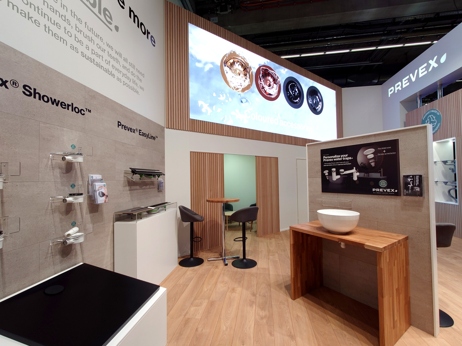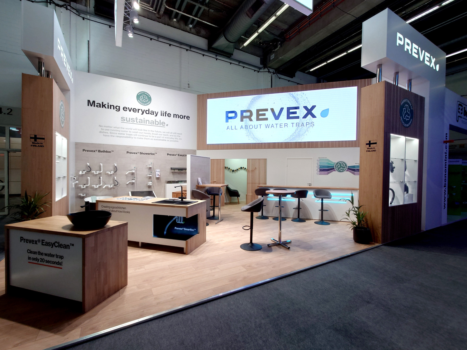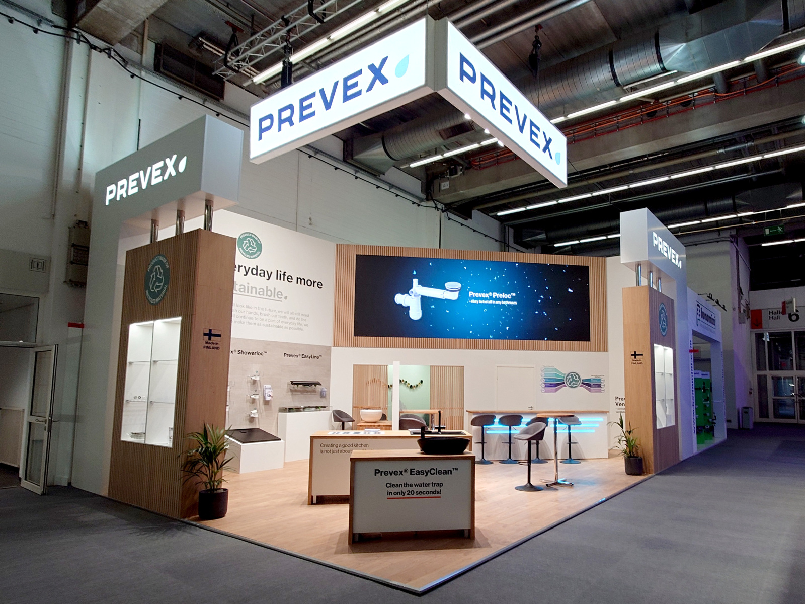 ISH on maailman johtava HVAC + water -messu eli suomeksi LVI-alan messu. Laadukkaita vesilukkojaan siellä oli esittelemässä Oy Prevex Ab. Prevexin osaston keskipisteenä oli 6×2 m videoseinä. Osaston ilme oli harmoninen sekoitus valkoista ja tammea. Massiivitammesta oli tehty kalusteita sekä myös tammiviilulevystä rimasomisteita. Näytön lisäksi ledejä oli myös led-matoissa, joiden kirkas ja tasainen valo toi sekä tulostetut kangaslogot että cnc-leikatut levyjen logot hienosti esiin.